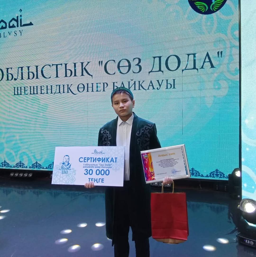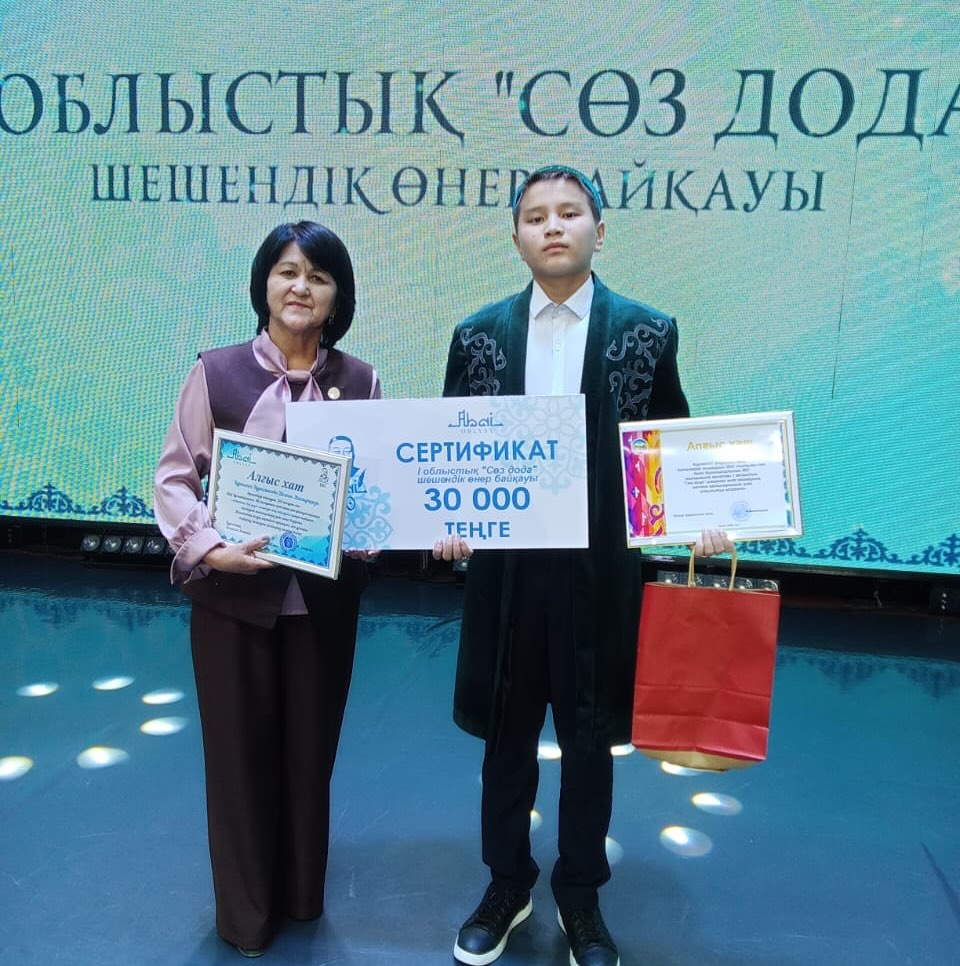 Уржар ауданында өткен Ақтамберді жыраудың 350 жылдығы мен Абай Құнанбайұлының 180 жылдығына орай алғаш рет ұйымдастырылған І облыстық “Сөз дода”шешендік өнер байқауына қатысып, арнайы сертификатпен марапатталған 8”В”сынып оқушысы Әнуарұлы Әмір мен жетекшісі Нургамысова Шолпан Махмұтқызын құттықтаймыз!